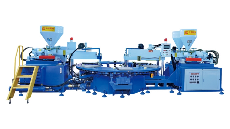 AUTOMATIC ROTARY TYPE THREE COLOR STRAP / HIRIZONTAL INJECTION MOULDING MACHINE1.This machine is equiped with multi-function operation system ,can produce one/two/three colors pvc strap and sole of children shoes.