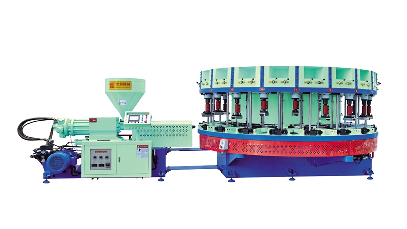 AUTOMATIC ROTARY TYPE DIRECTLY INJECTING AND FORMING MACHINE FOR MONO-COLOR LEISURE AND SPORTS SHOES