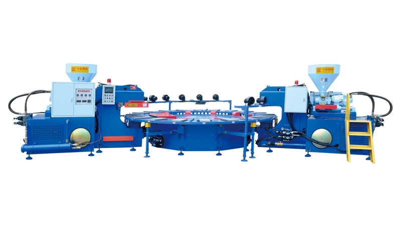 SC-720-2全自動回轉式 雙頭雙色/TPR/PVC鞋底注射成型機1.該機臺可生產雙色TPR/PVC底片及鞋底。